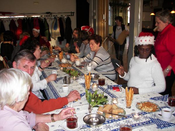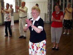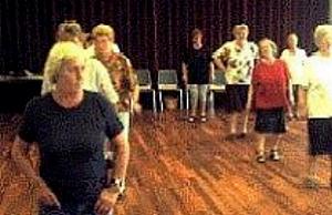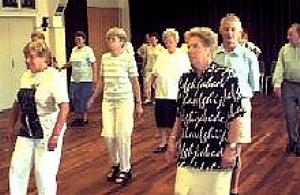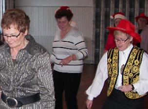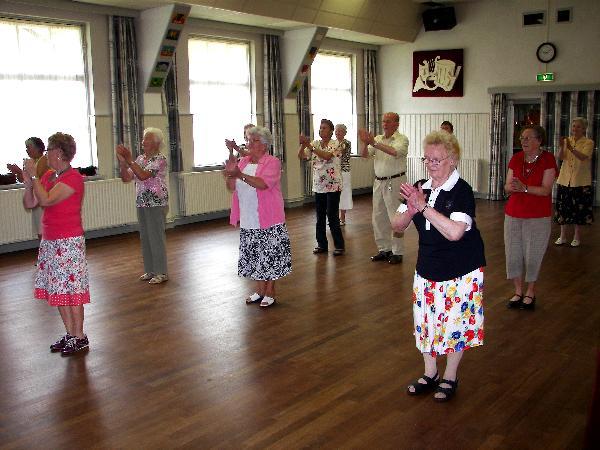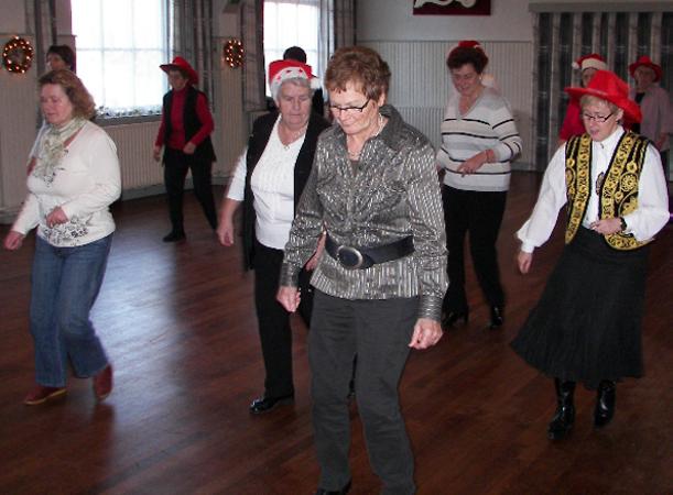 Ouderen die graag dansen kunnen in Lennisheuvel hun hart ophalen. Onder de bekwame leiding van danslerares Inie de Prest (middenrechts) zetten in gemeenschapshuis Orion iedere woensdagmiddag drie dansgroepen hun beste beentje voor. Volksdansgroep "Vlug en Vrolijk" (linksboven) zwiert 's middags om 13.30 uur door de zaal op het ritme van vrolijke volksdansmuziek. Daarna is de zaal voor de line dancers (rechtsboven). De eerste groep om 14.30 uur; de tweede om 15.30 uur. Zodra de countrymuziek inzet komen de line dancers als bij toverslag in beweging. Tegen kerstmis wordt het seizoen altijd afgesloten met een gezellige feestje (middenlinks). Inie de Prest heeft eer van haar werk: het plezier straalt ervan af. De twee foto's onderaan zijn gemaakt toen de lijndansers met hun eerste lessen begonnen. Veel dansers van het eerste uur zijn door andere liefhebbers vervangen.